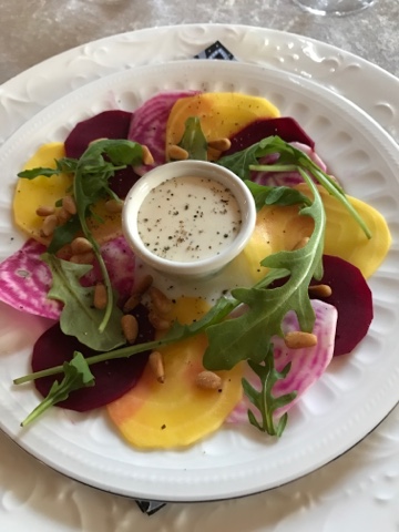 Men då hade man missat en del bland annat denna förrätt. Rödbetscarpaccio med getostkräm.
